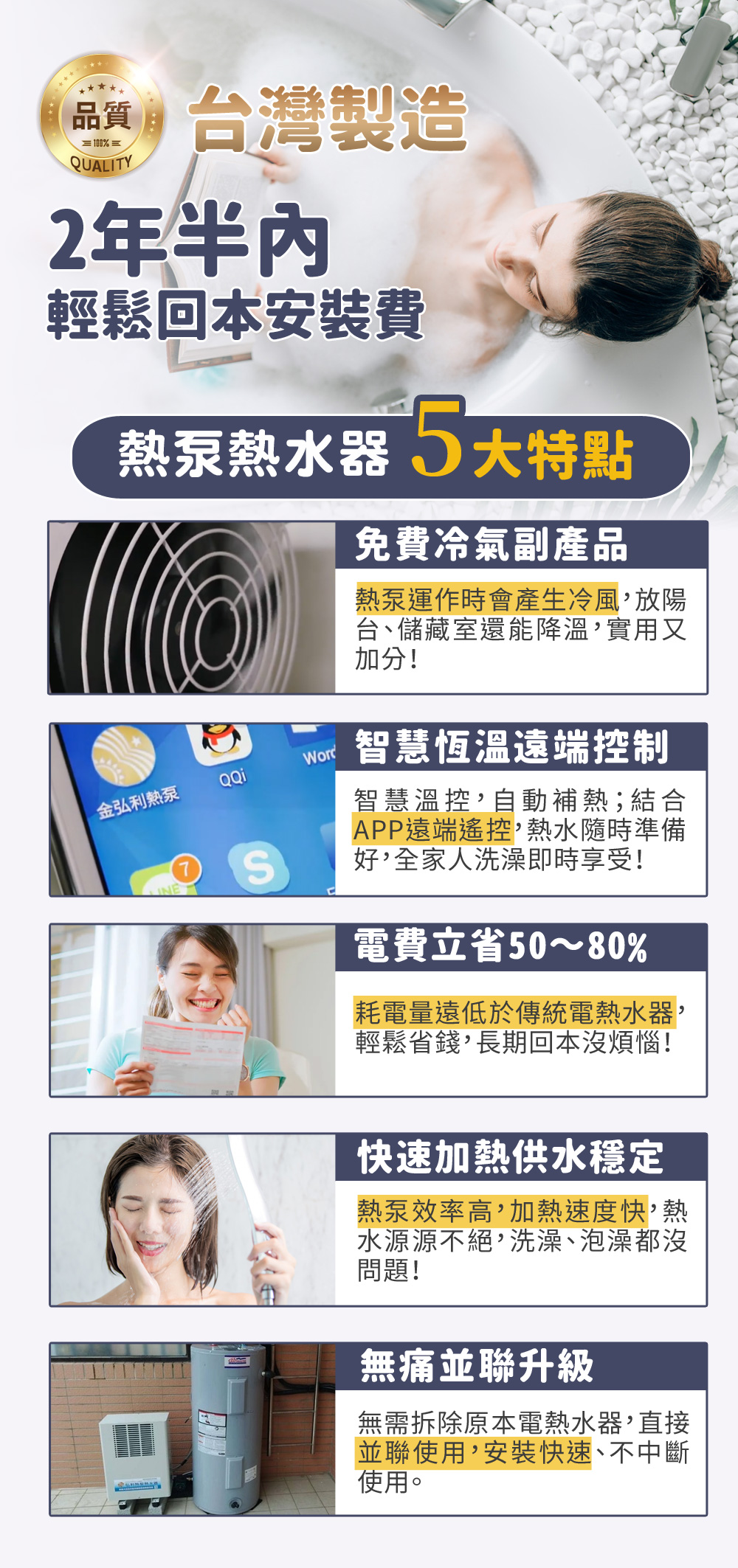 - 熱泵熱水器全系列皆為台灣製造,品質穩定、售後有保障。
